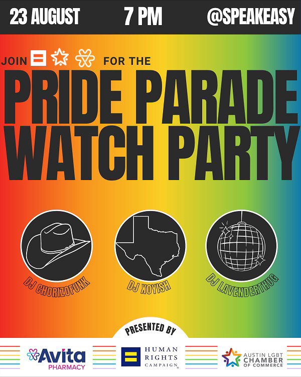 We are so excited to partner with Avita Pharmacy and HRC of Austin for a Pride Parade Watch Party at Speakeasy! The Austin LGBT Chamber will also be live-streaming the parade on our socials.