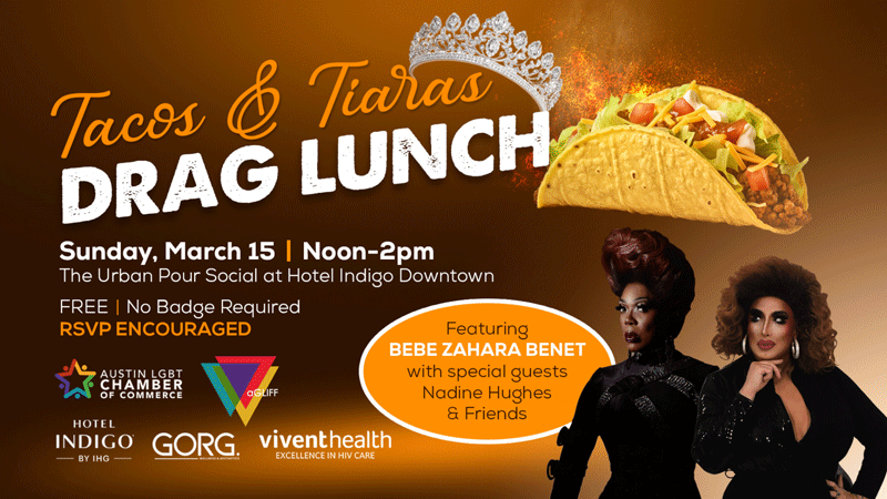 Tacos & Tiaras Drag Lunch – Join the Austin LGBT Chamber, aGLIFF, and community partners for an unforgettable performance starring RuPaul’s Drag Race winner Bebe Zahara Benet, hosted by Austin drag icon Nadine Hughes and featuring additional local performers. Expect high glamour, big personality, and plenty of sparkle.