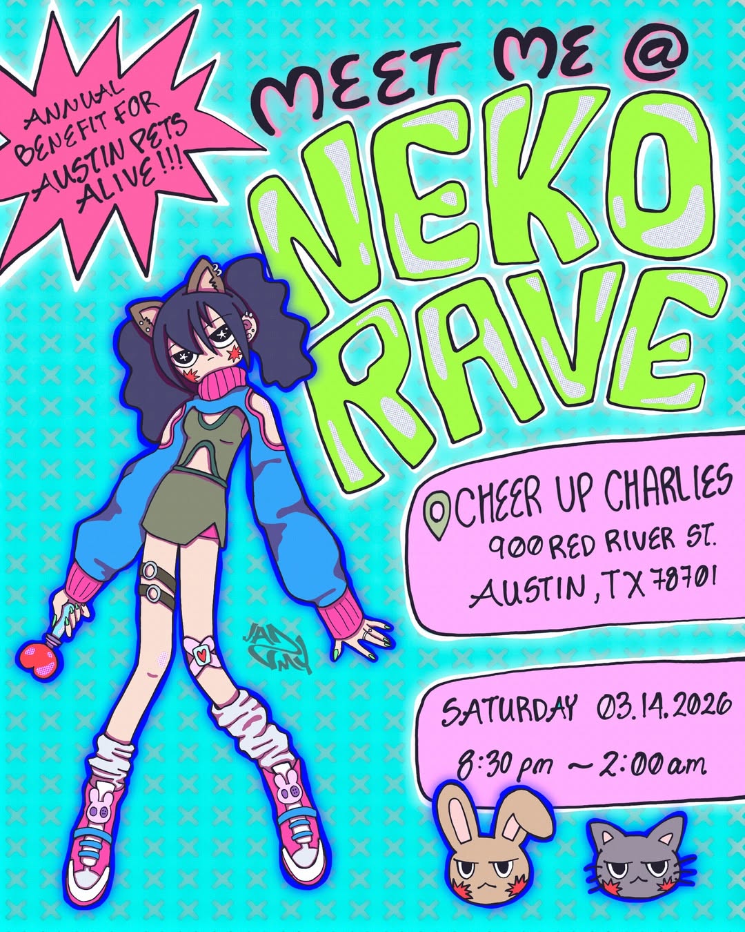 Neko Rave’s Second Annual benefit show independently curated by Haus of Madnes and sponsored by Ashwell ATX in partnership with Cheer Up Charlies. Come dance all night long, and while you having a good time give back to Austin Pets Alive! Universal Madnes commits $2 of every ticket as a donation to the animal shelter.