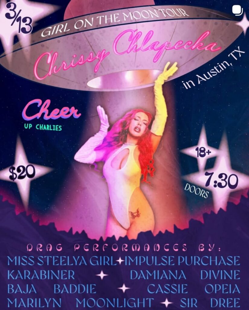 Calling all lesbians, women loving women, sapphic, folx who made their barbie’s kiss when they were kids… the lesbian pop diva herself is officially stopping in Austin and you DON’T wanna miss this. We have a stellar drag showcase, full of your favorite lesbionic drag queens, kings & things PLUS some fierce DJs sets playing throughout the night to get you hot & ready for the Queen herself, Chrissy Chlapecka.